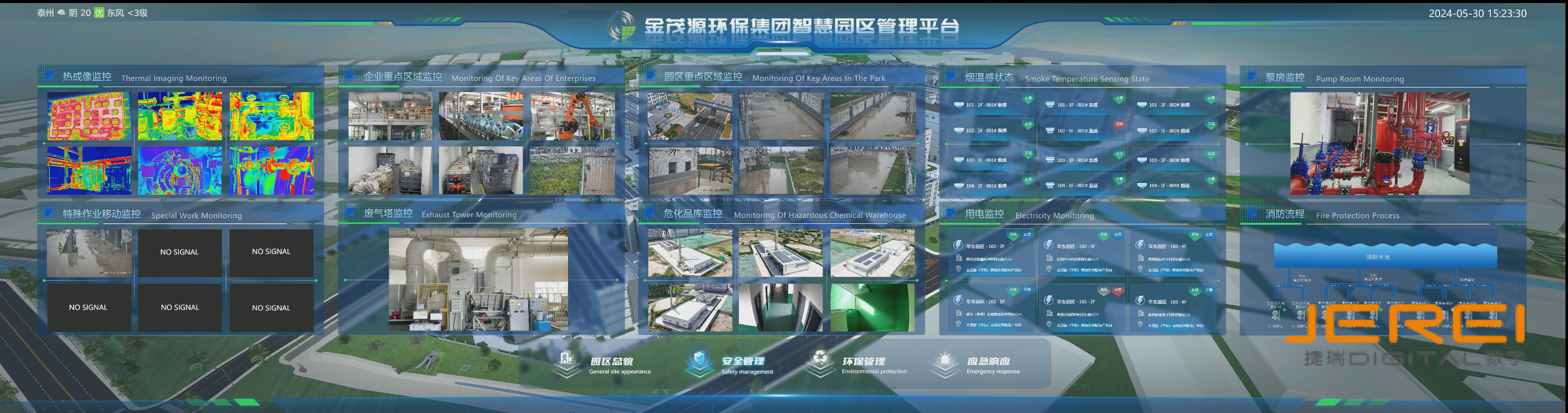 金茂源(华东)表面处理循环经济产业园坚持预防为主的理念,强化园区三级管理体系(企业主体—园区管理—社会监管),通过智能化、信息化手段进行高效管理和运行。以生产安全与生态安全监控为基础,构建了“及时预警、精准报警、快速处警”的安全风险防控体系。